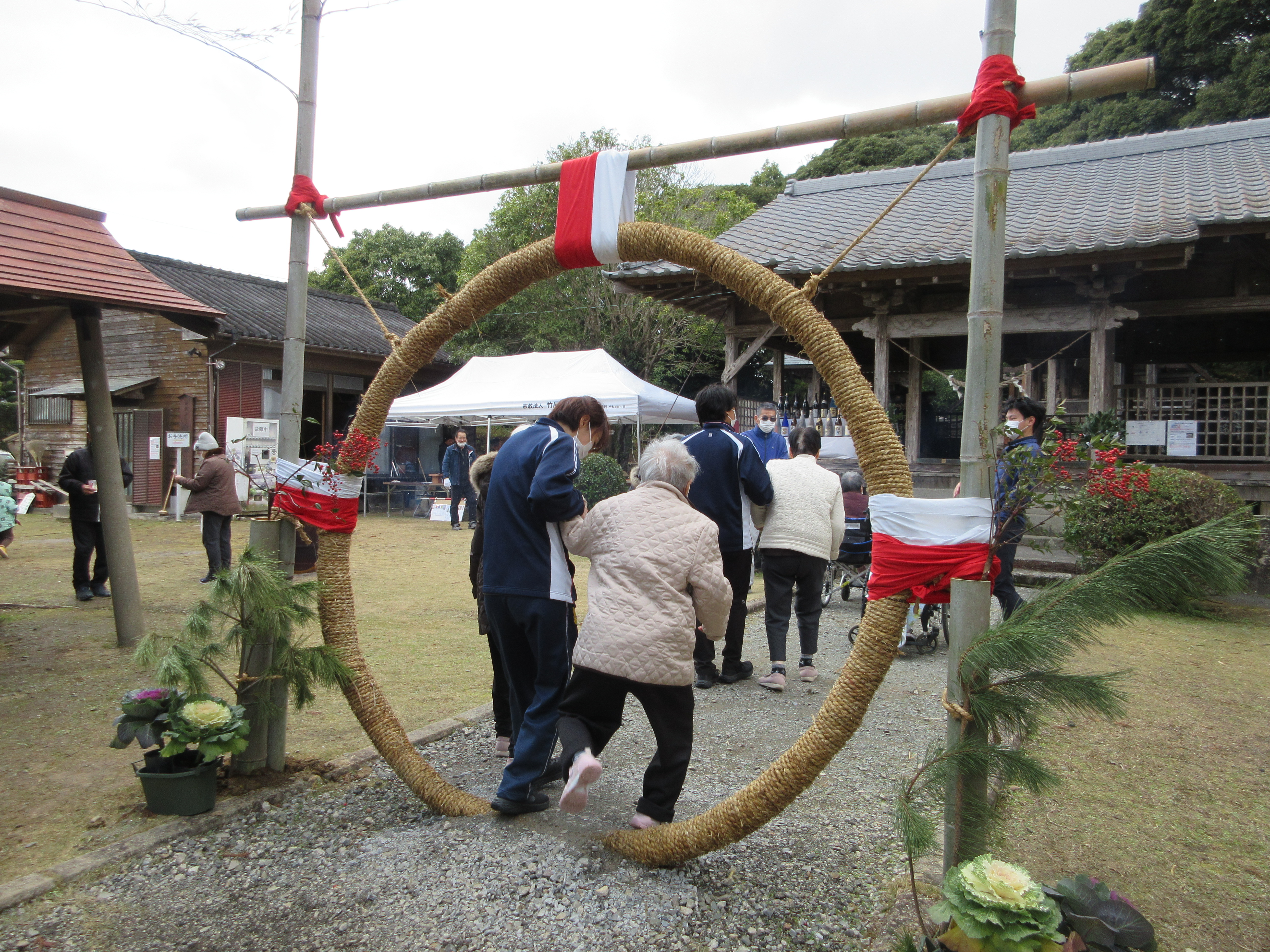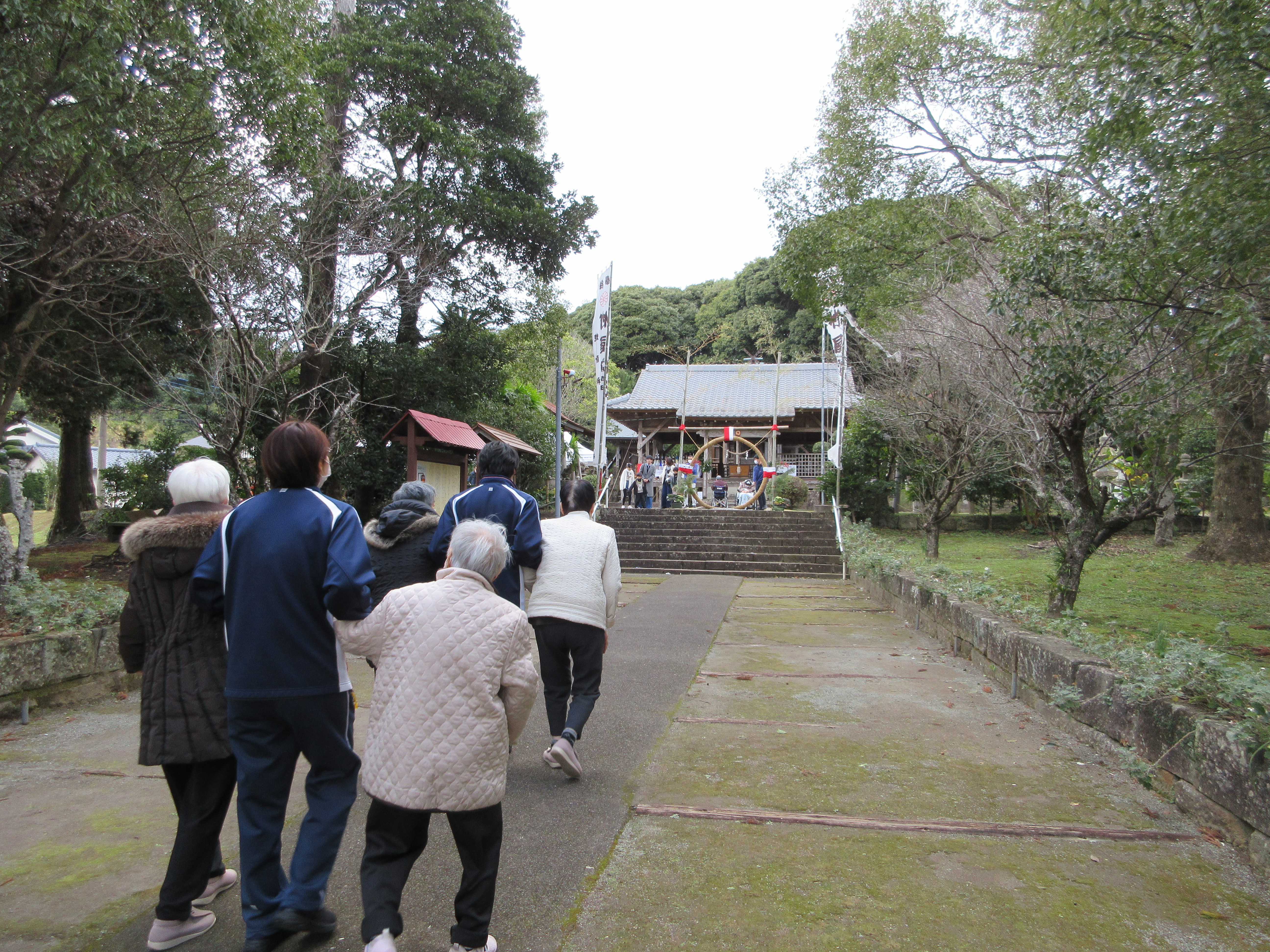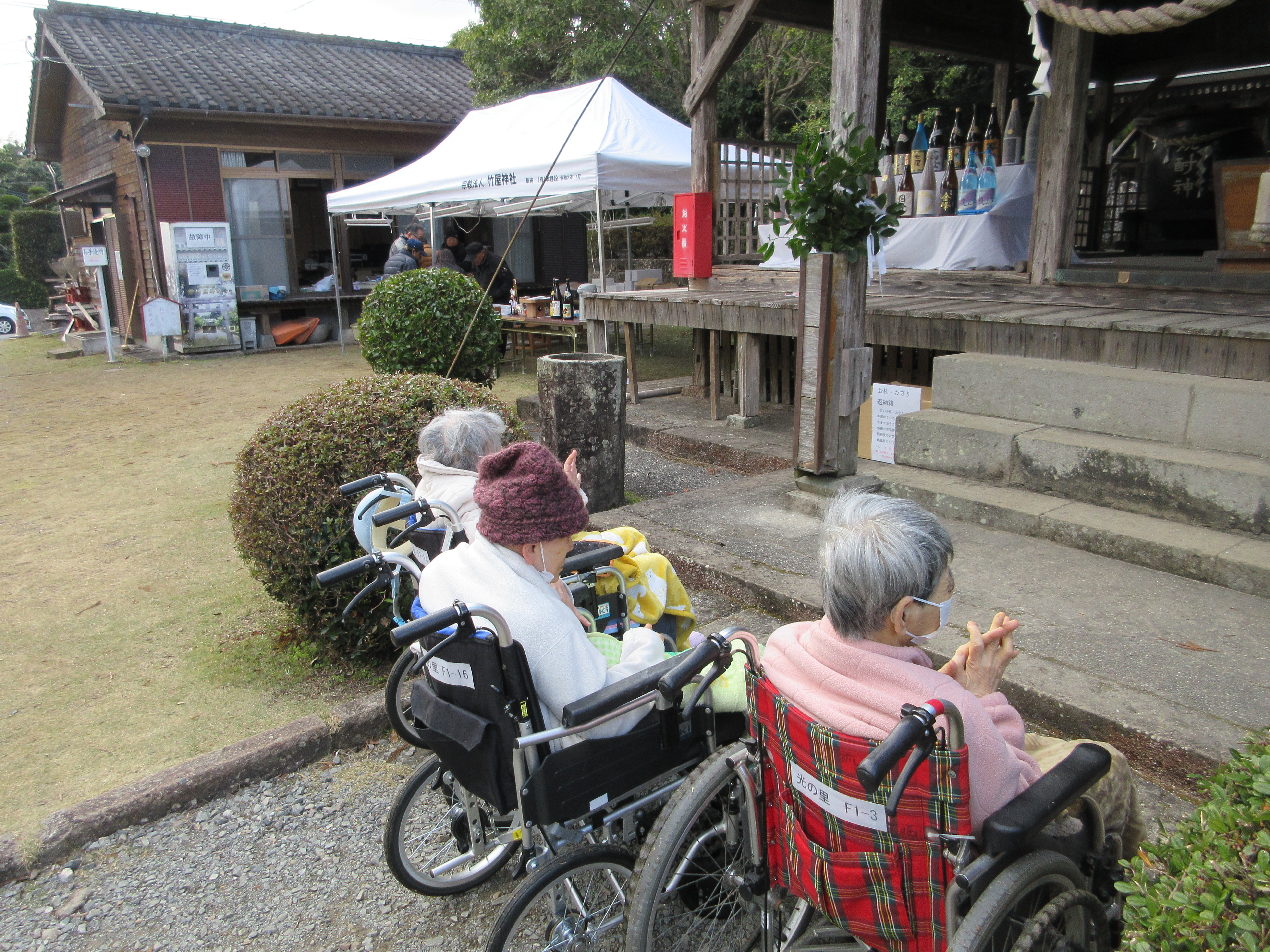 利用者様方は暖かい服装で施設のマイクロバスとリフト車に乗り込み、南さつま市の竹田神社を通った後、近隣の竹屋神社へお参りに行きました。